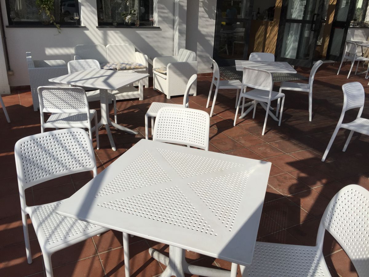 Для использования мебели в данном кафе, был выбран комплект мебели созданный специально для коммерческого применения. И им оказался набор ROZES, комплект не занимающий много места и отлично справляющийся с задачей размещения большого количества людей на небольшой территории. Это мебель которая не выгорает и не деформируется от солнечных лучей и палящего солнца. И к тому-же она устойчива к высокой влажности и к низкой температуре.